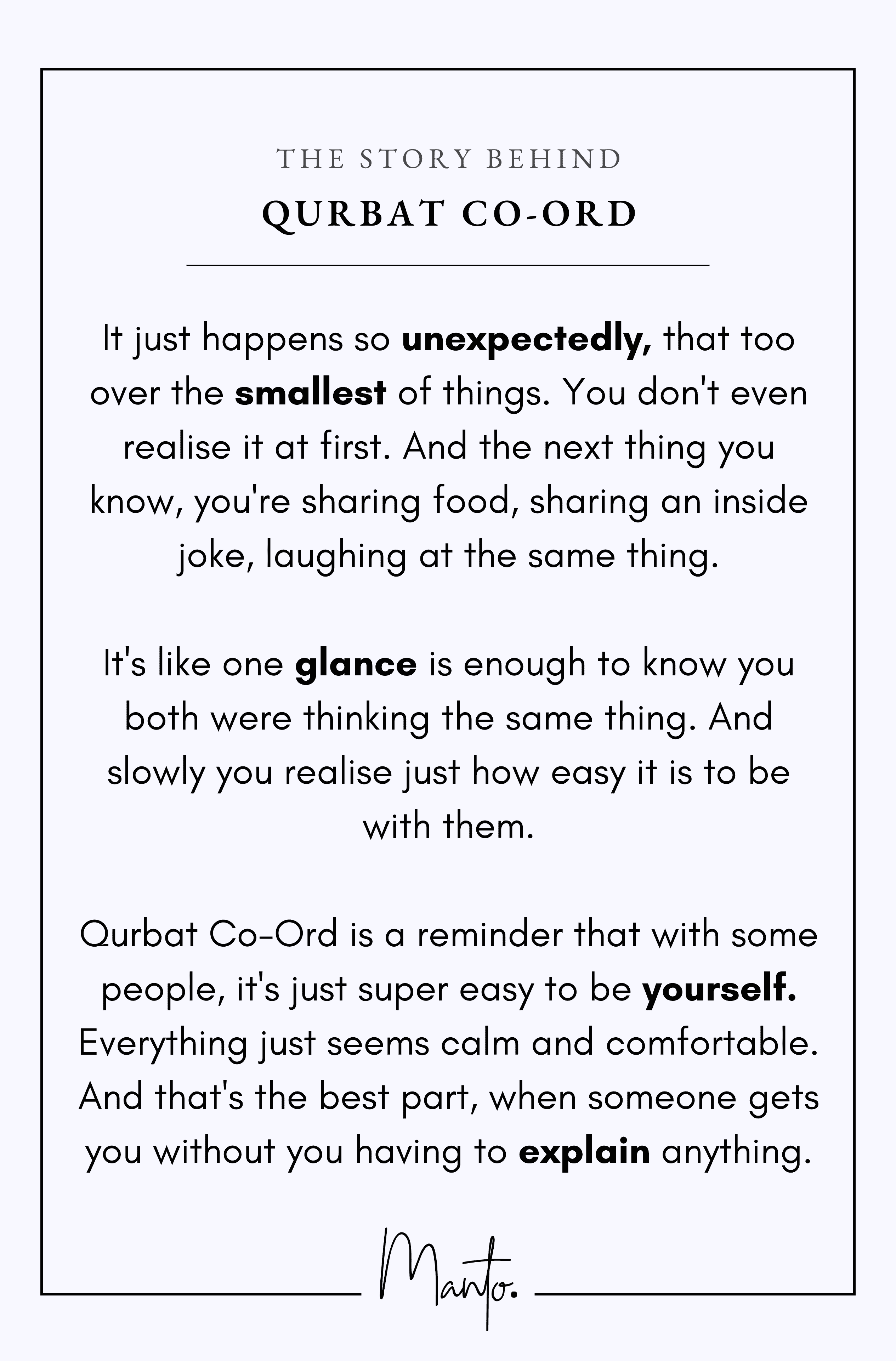 Qurbat Co-Ord is a reminder that with some people, it's just super easy to be yourself. Everything just seems calm and comfortable. And that's the best part, when someone gets you without you having to explain anything.
