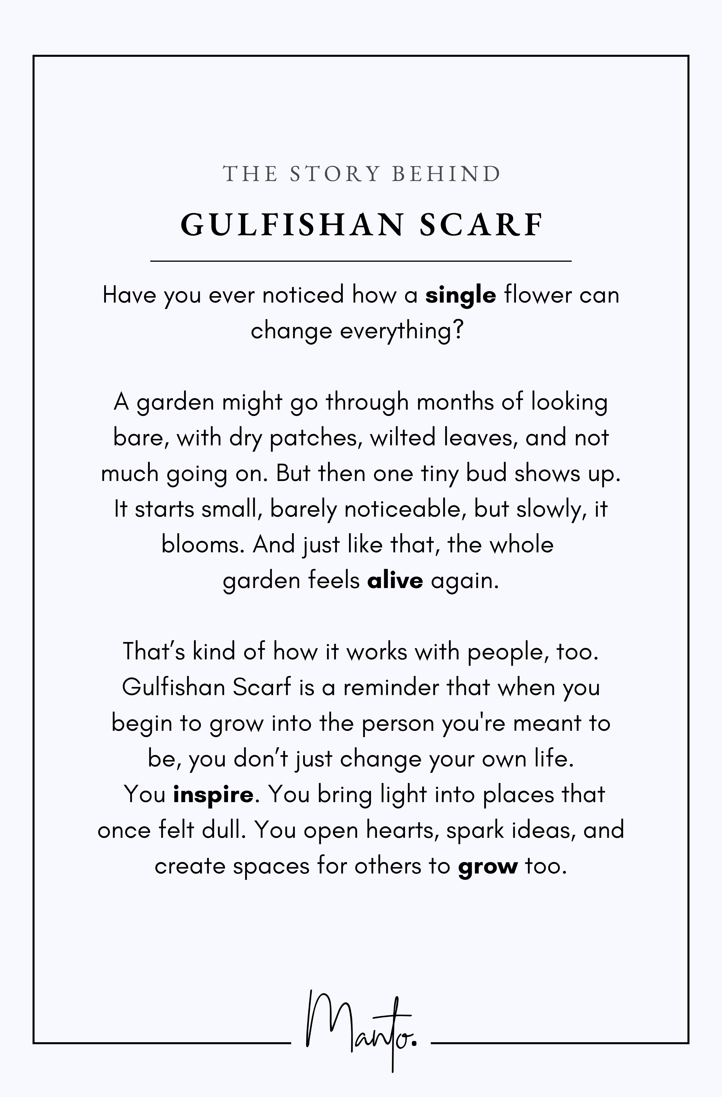 Gulfishan Scarf is a reminder that when you begin to grow into the person you're meant to be, you don’t just change your own life. You impact everything and everyone around you. You inspire. You bring light into places that once felt dull. You open hearts, spark ideas, and create spaces for others to grow too.