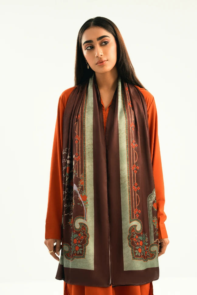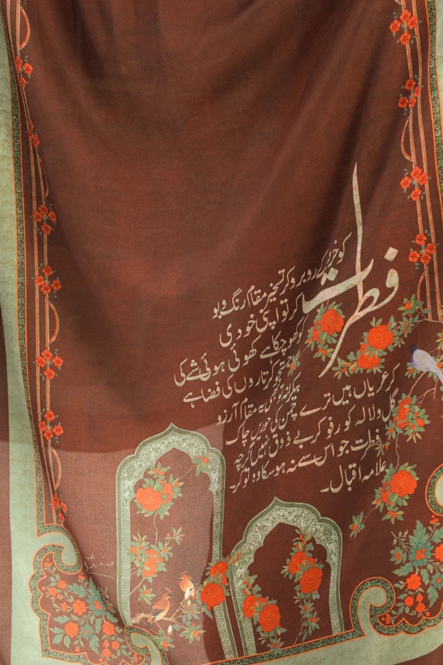 Rubaru Scarf is a silk scarf featuring the words of Allama Iqbal throughout.