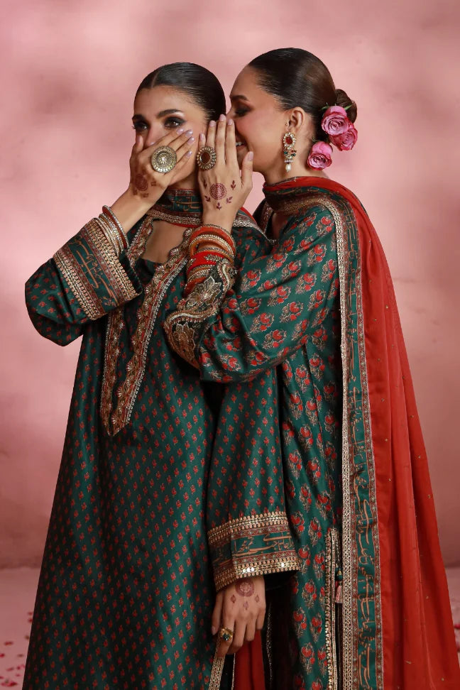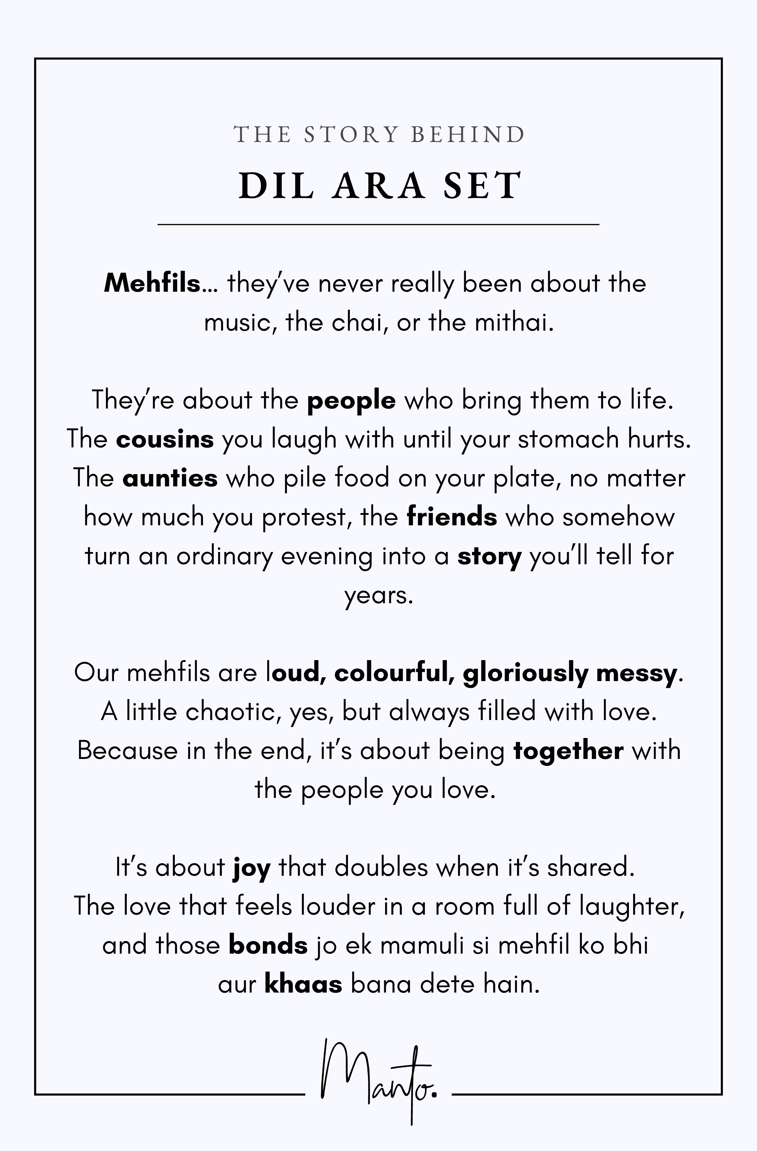 The Dil Aara 3-Piece Set is crafted from premium raw silk and paired with straight pants. The dupatta, adorned with delicate lace detailing, is elevated with Sahir Ludhianvi’s calligraphy beautifully woven throughout.