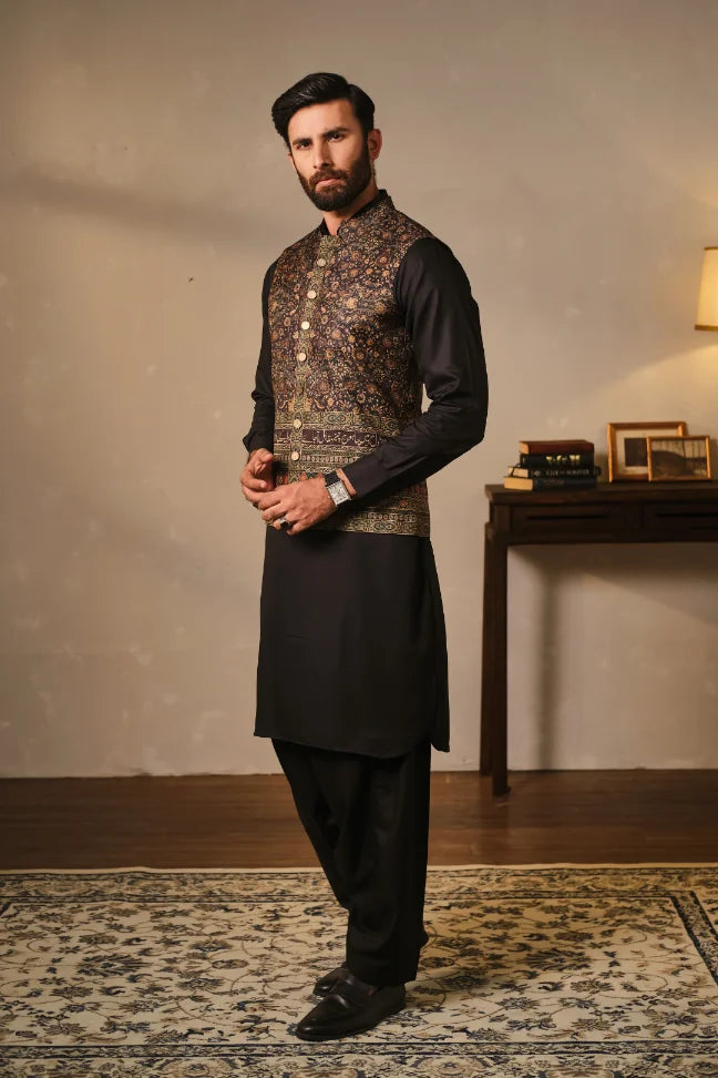 Men's Black Sikandar Vasket, made from Premium Raw Silk, features Urdu calligraphy of poetry by Behzad Lakhnavi.