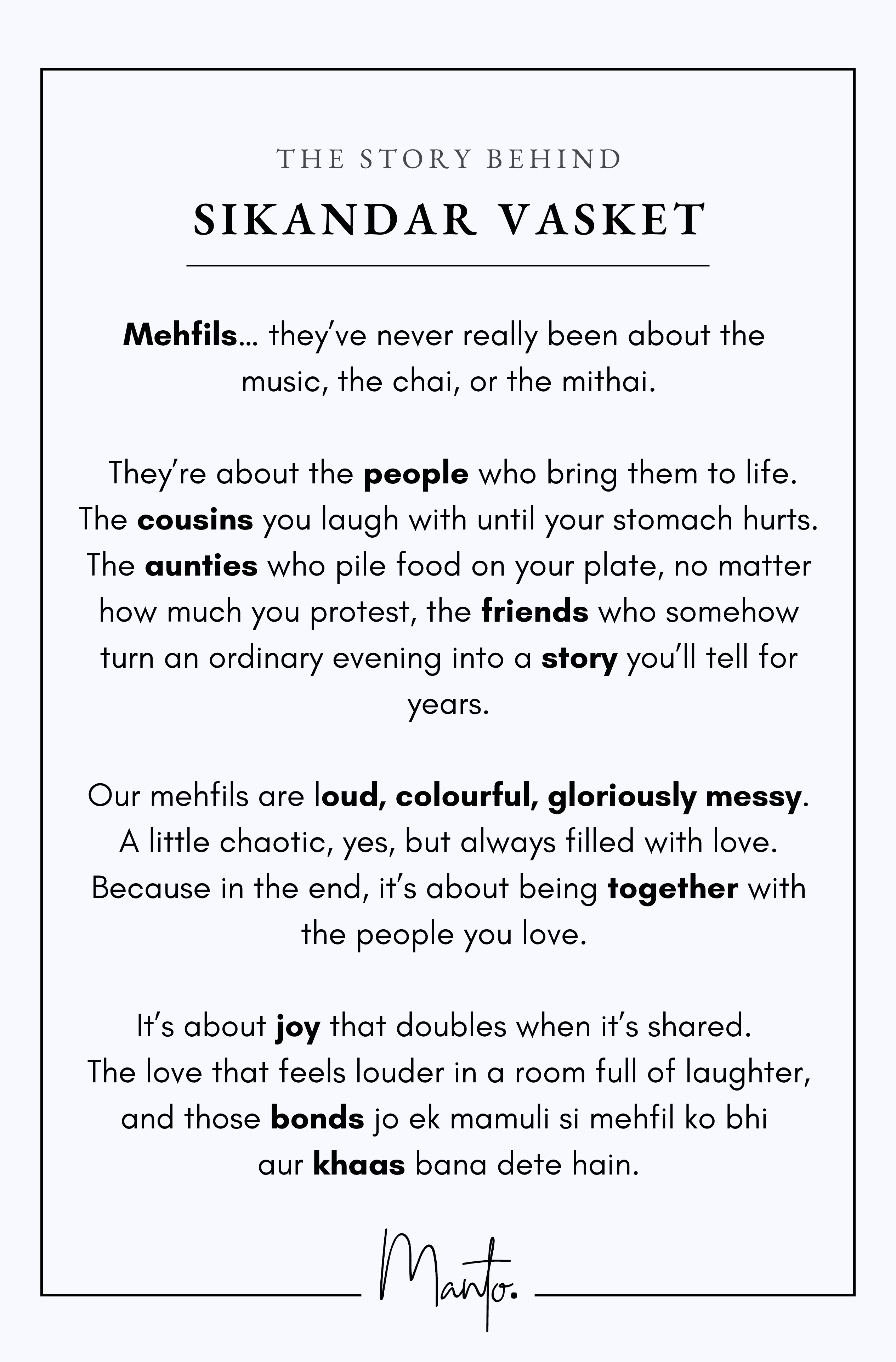 Mehfils… they’ve never really been about the music, the chai, or the mithai. They’re about the people who bring them to life. The cousins you laugh with until your stomach hurts. The aunties who pile food on your plate, no matter how much you protest, the friends who somehow turn an ordinary evening into a story you’ll tell for years.