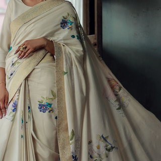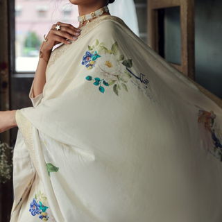 The Roop Saree, made from premium Lawn, features a Cotton Silk blouse. With a zari border all around, this ready-to-wear saree features words such as jhalak, mehek, gul all across.