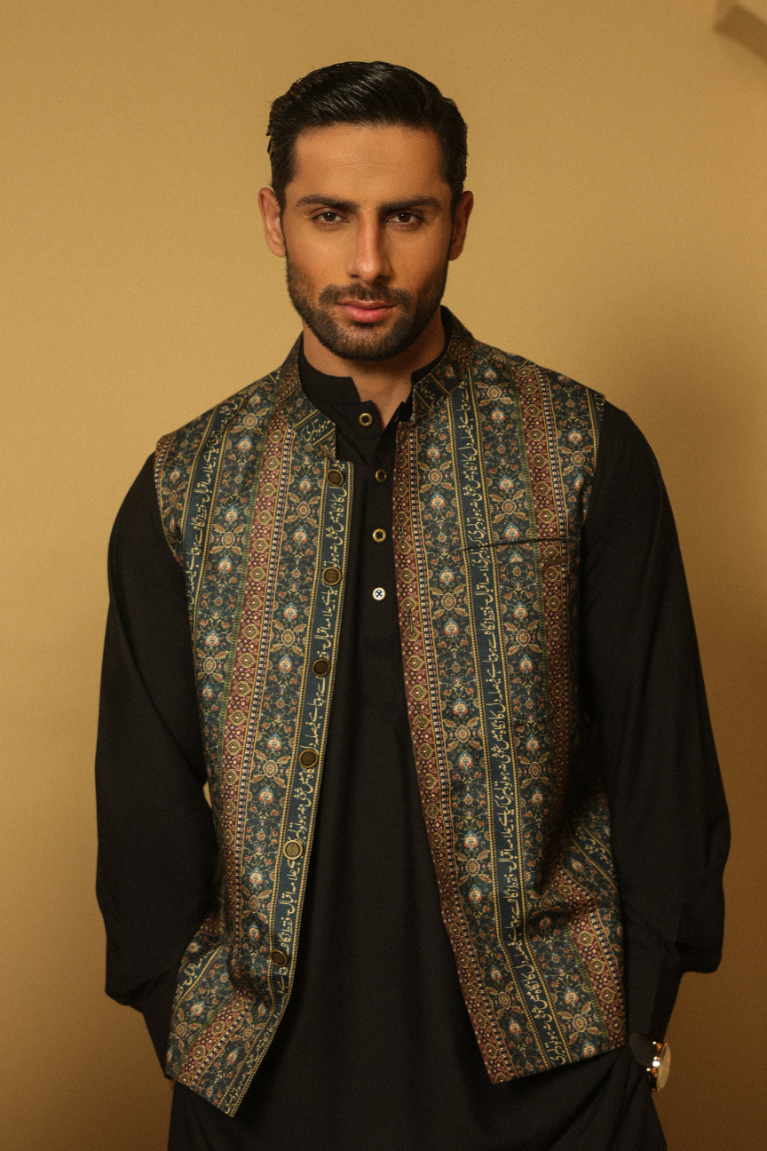 Akbar is a tailored men’s waistcoat made with premium raw silk, featuring the words of Allama Iqbal.
