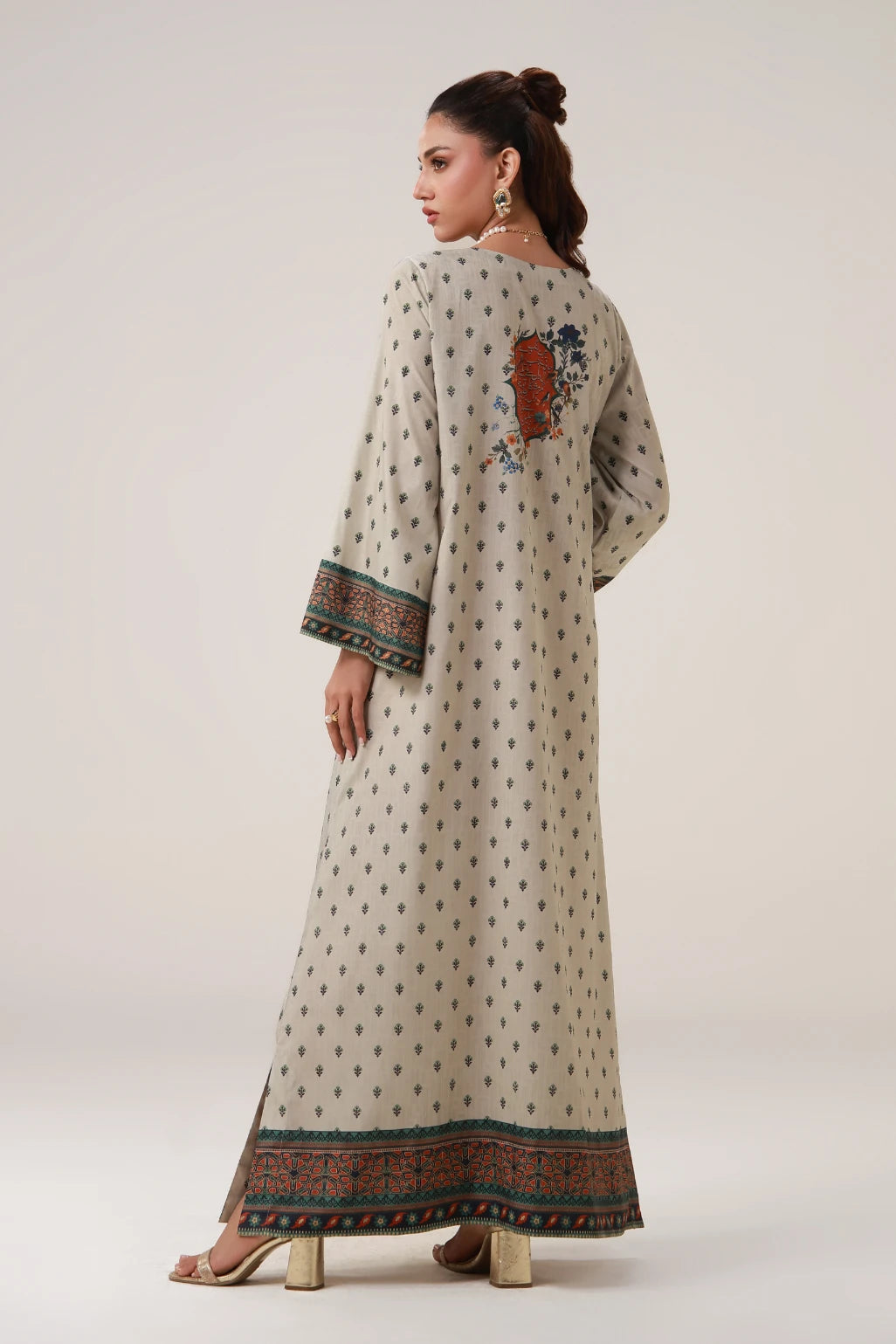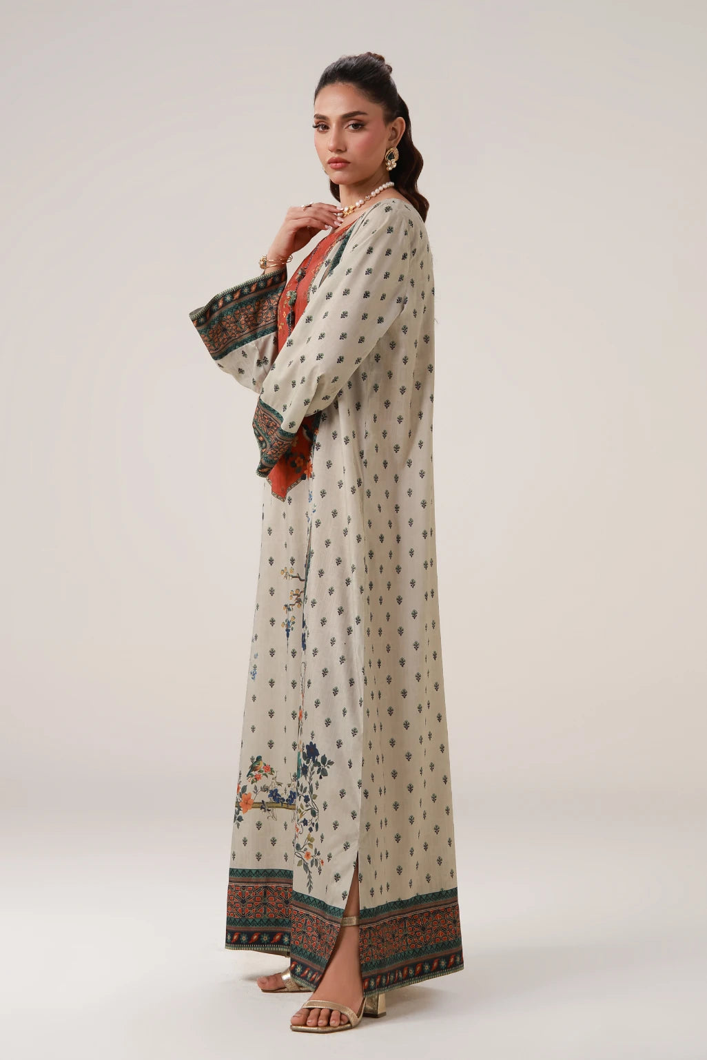 The Dillagi Kaftaan is a printed kaftan with embellishments on the neckline, and the words of Jaleel Manikpuri calligraphed across.