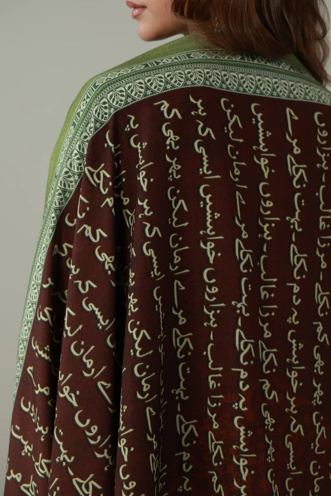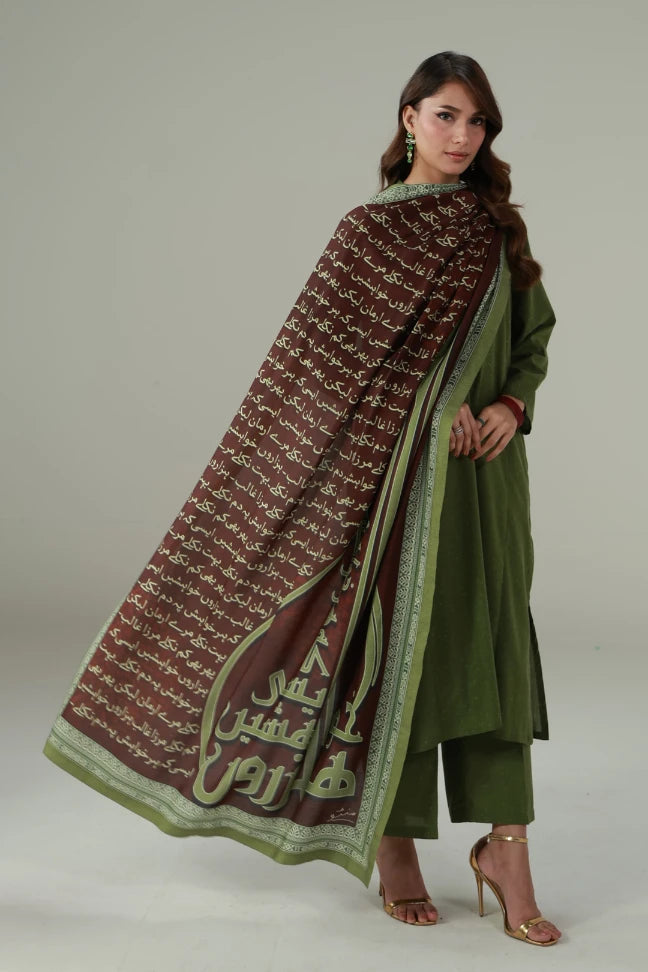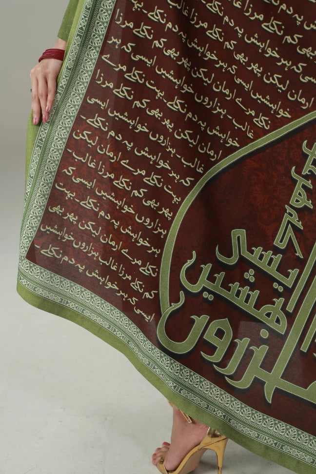 Raaz Odhni, made from Cotton Silk, is a printed odhni featuring the words of Mirza Ghalib calligraphed throughout.