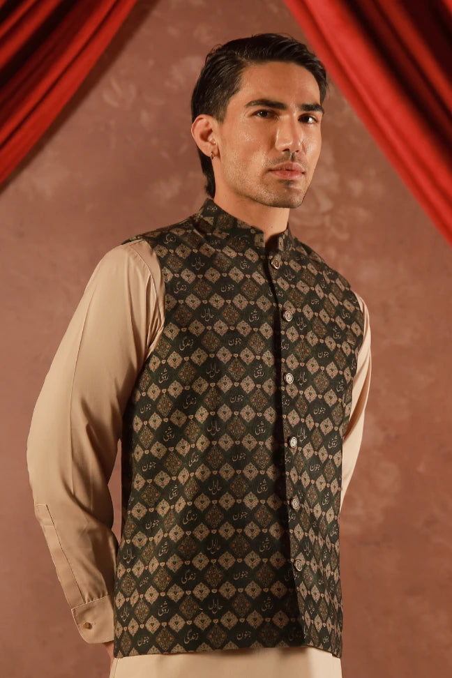 Premium velvet waistcoat featuring Urdu words such as junoon, haal-e-dil, roshni, zindagi calligraphed across.