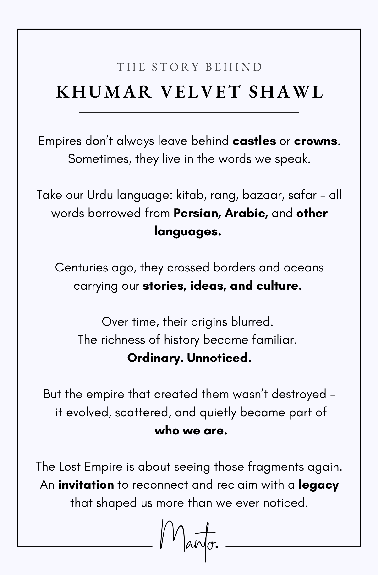 Khumar Shawl, is a reversible Shawl. Made with premium Velvet, the back of this shawl features a printed Raw Silk design. Allowing you to wear it either way and make a statement!