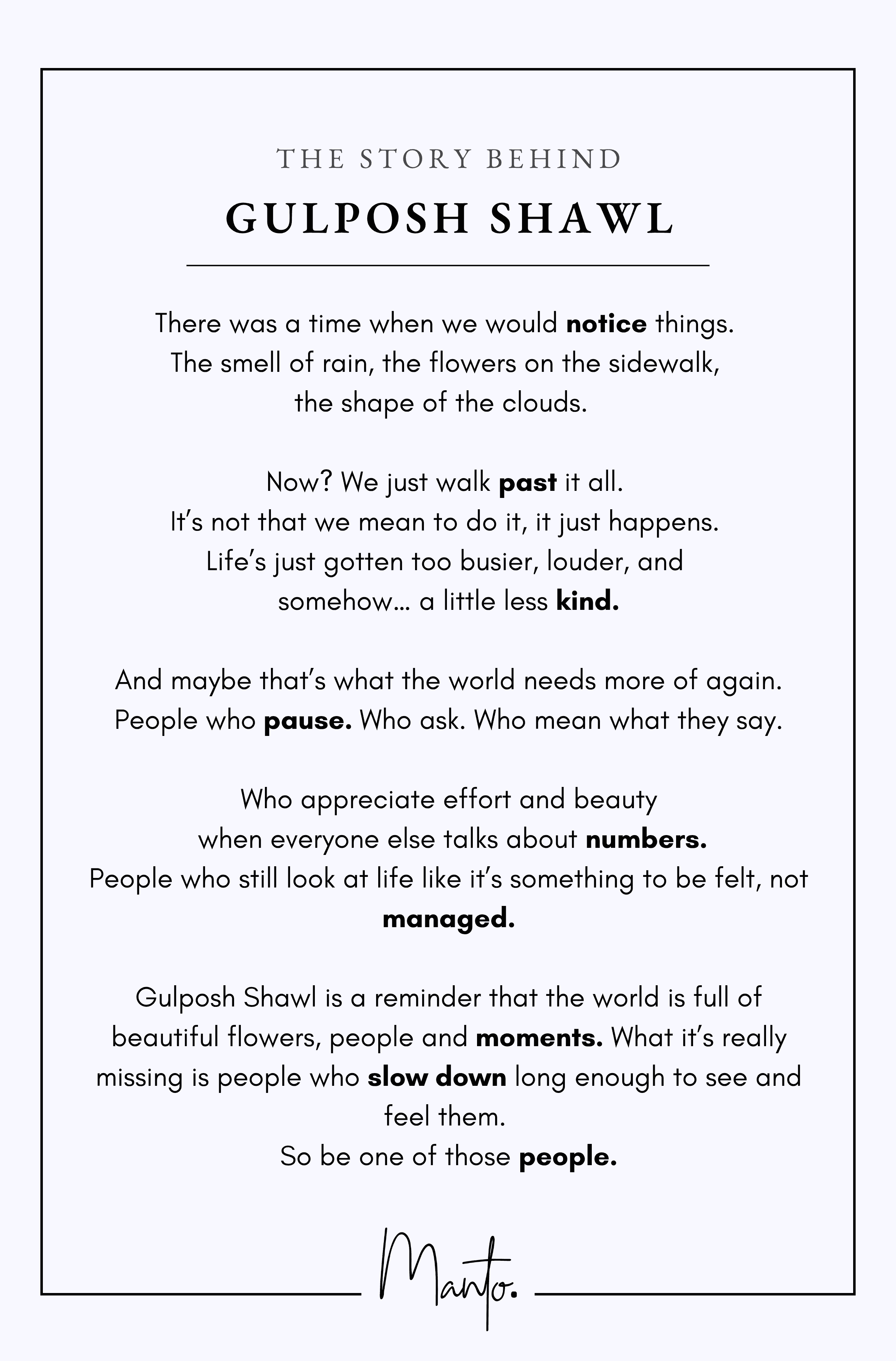 Gulposh Shawl is a reminder that the world is full of beautiful flowers, people and moments. What it’s really missing is people who slow down long enough to see and feel them. So be one of those people.