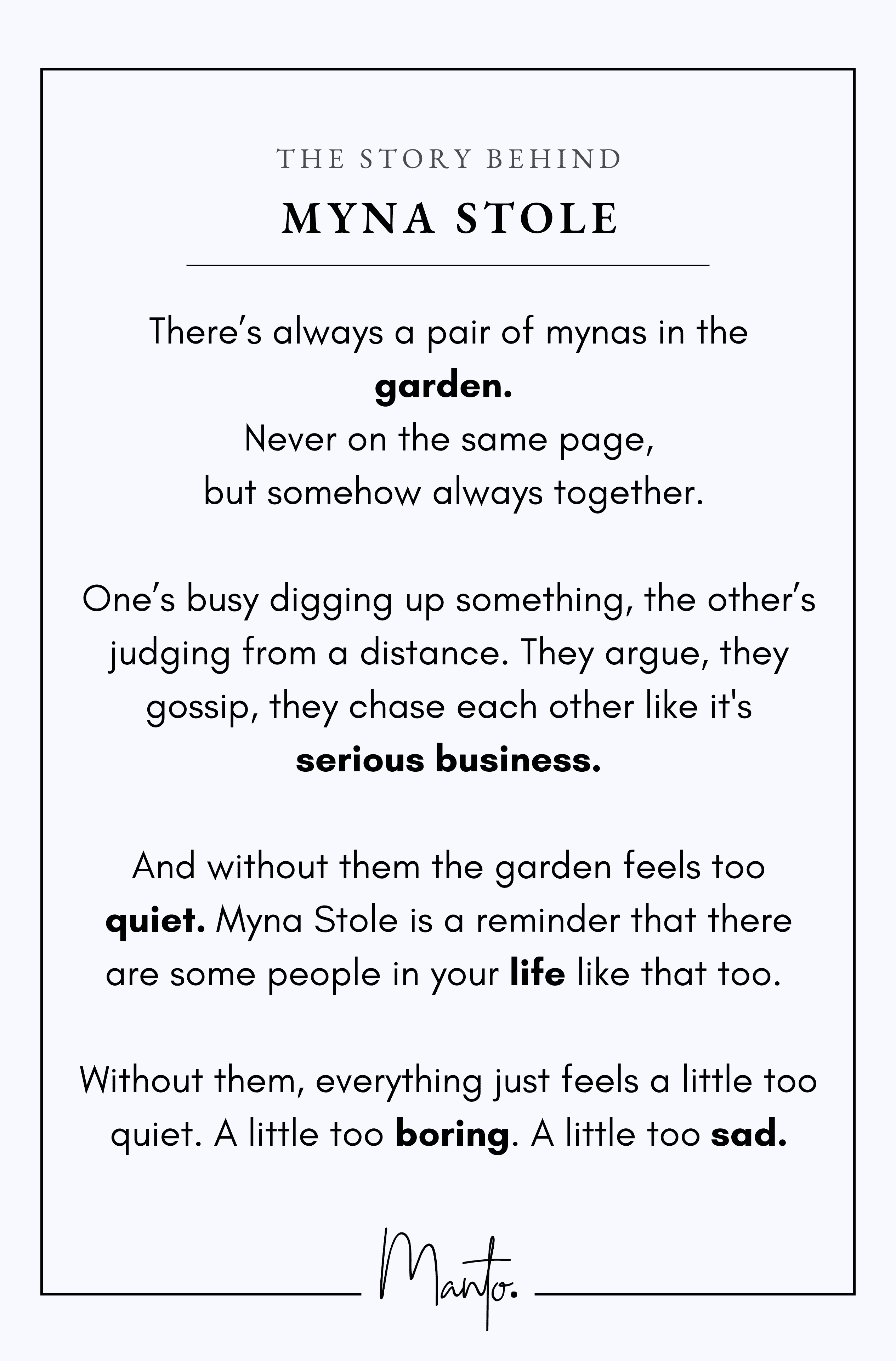 Myna Stole is a reminder that there are some people in your life like that too. Without them, everything just feels a little too quiet. A little too boring. A little too sad.