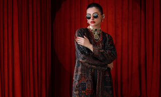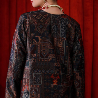 Make a statement with the luxurious Qala Coat, crafted from high-quality velvet, featuring Urdu calligraphy of poetry by Kaif Muradabadi. Adding a touch of glam to your outfit for chilly evenings & formal events.