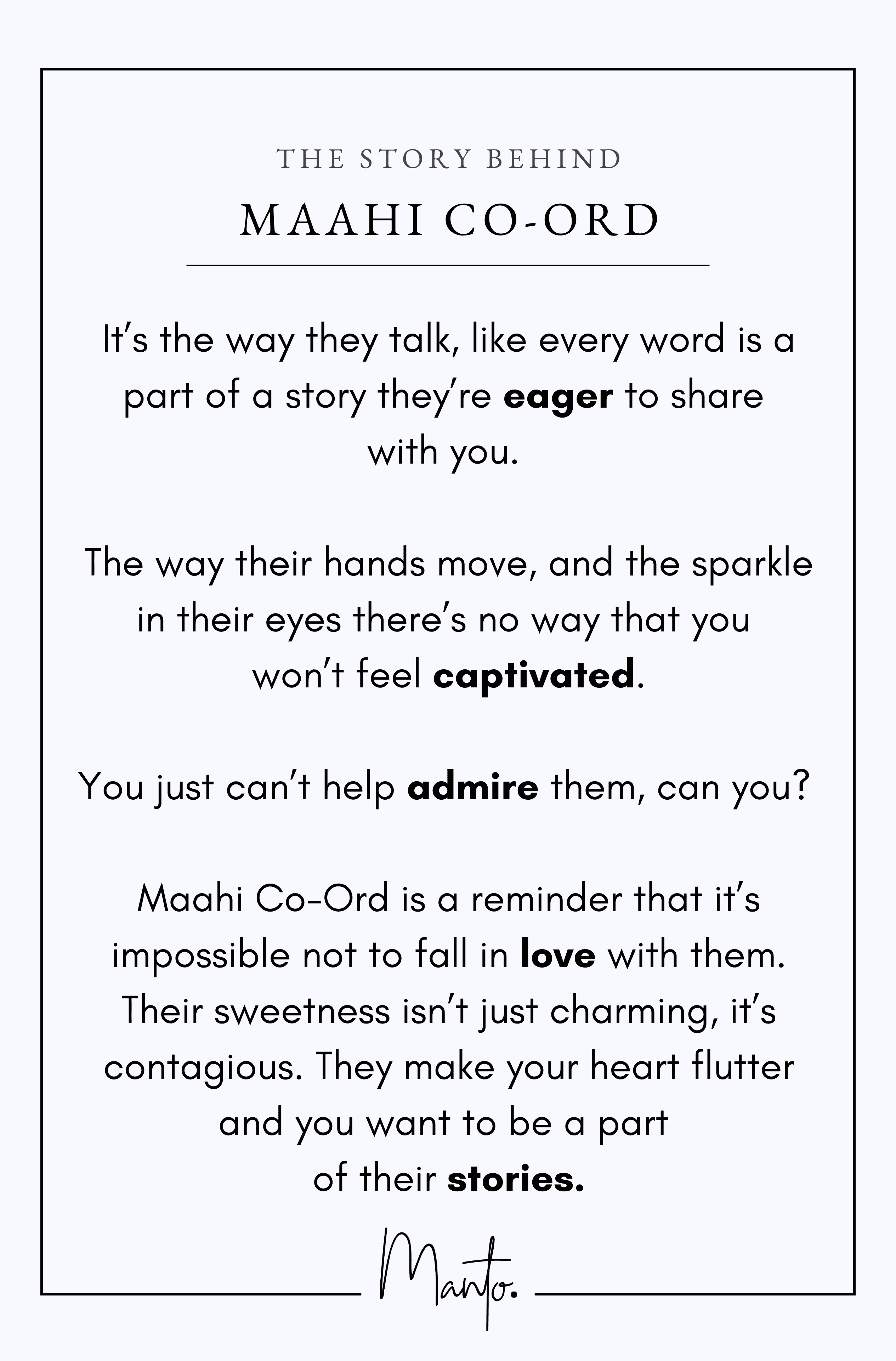 Maahi Co-Ord is a reminder that it’s impossible not to fall in love with them. Their sweetness isn’t just charming, it’s contagious. They make your heart flutter and you want to be a part of their stories.
