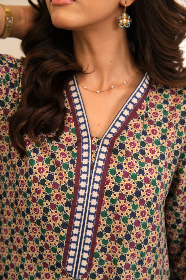 Printed 2-piece soft crepe set with a long length shirt & straight pants, Featuring calligraphy of Urdu letters.