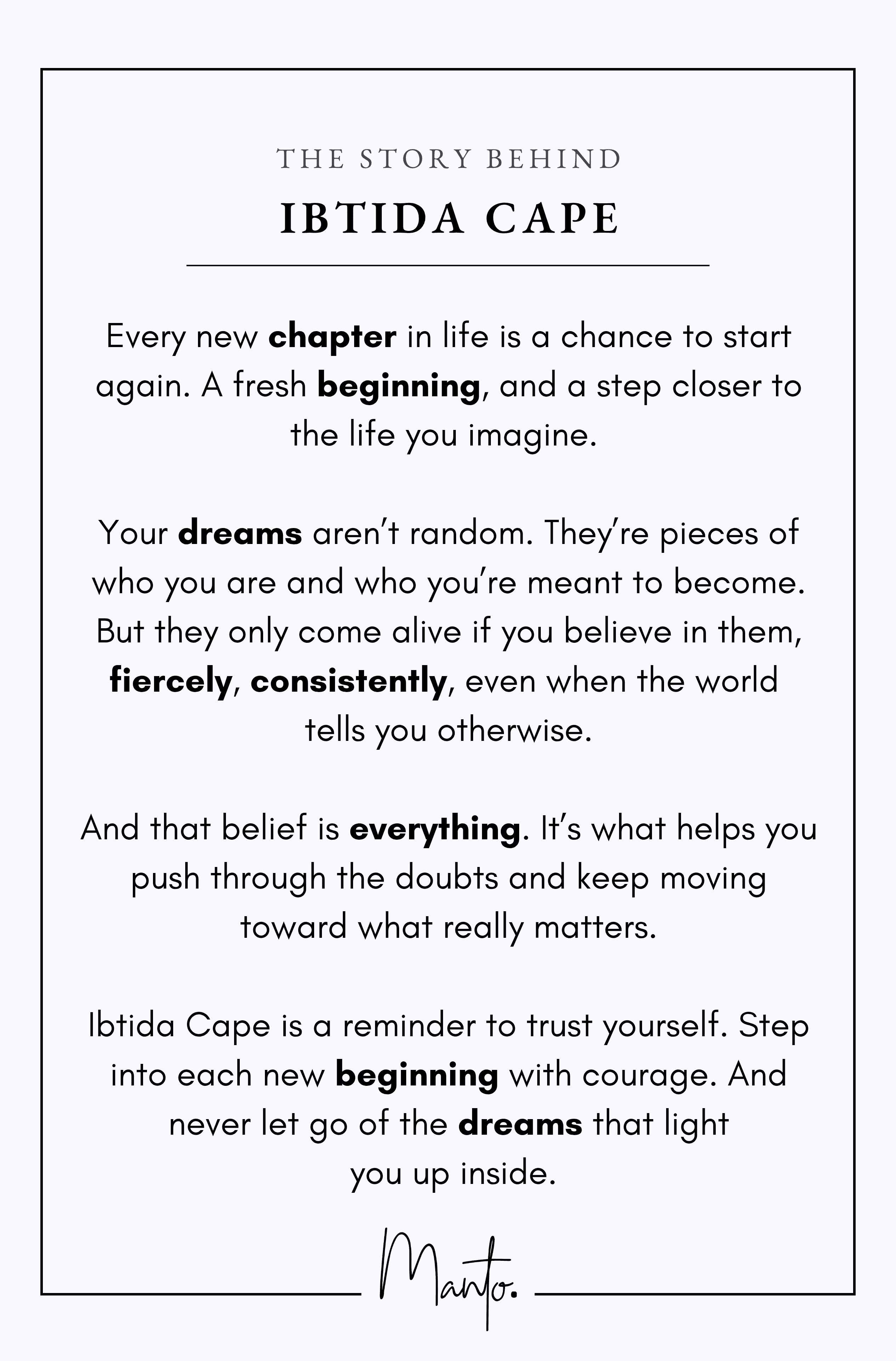 Ibtida Cape is a reminder to trust yourself. Step into each new beginning with courage. And never let go of the dreams that light you up inside.