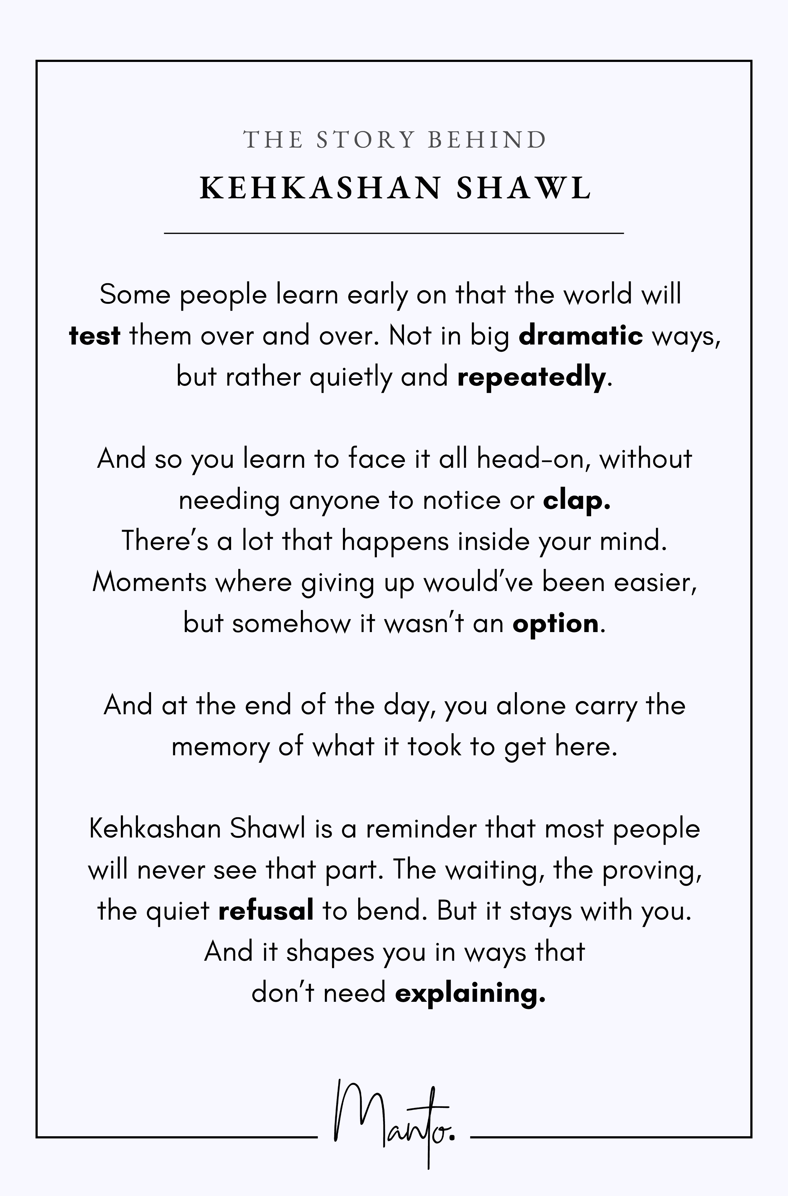 Kehkashan Shawl is a reminder that most people will never see that part. The waiting, the proving, the quiet refusal to bend. But it stays with you. And it shapes you in ways that don’t need explaining.