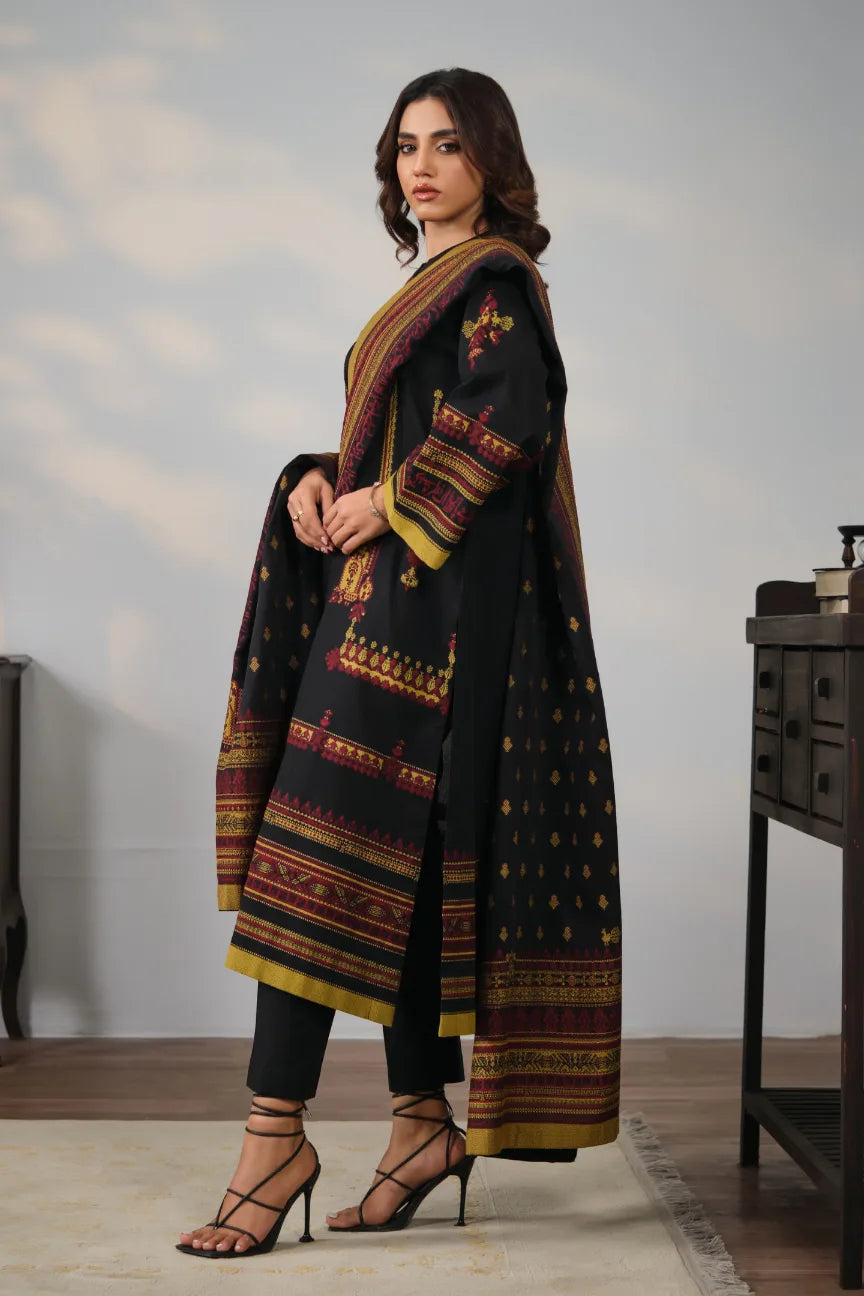 Jacquard 2-piece set, featuring Urdu calligraphy, of poetry by Sahir Ludhianvi, on long shirt paired with straight pants.