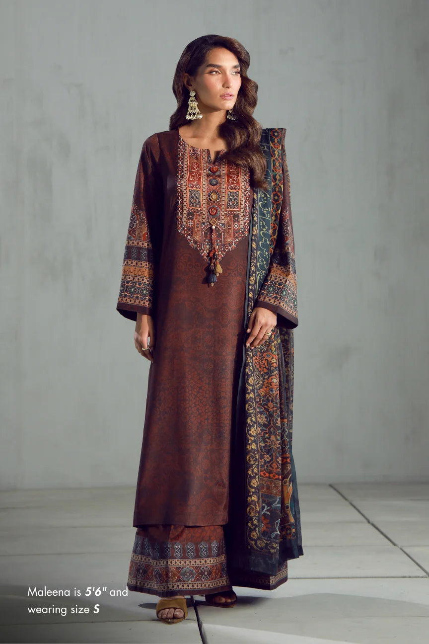 Printed 3-piece set is made from Soft Crepe. A long A-line shirt featuring tassels on the neckline and poetry of Allama Iqbal calligraphed throughout. Paired with a loose-fit Ijaar and a digital printed silk dupatta!
